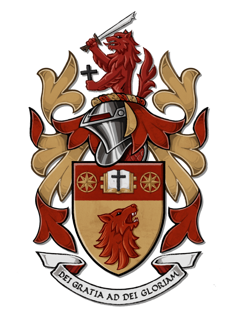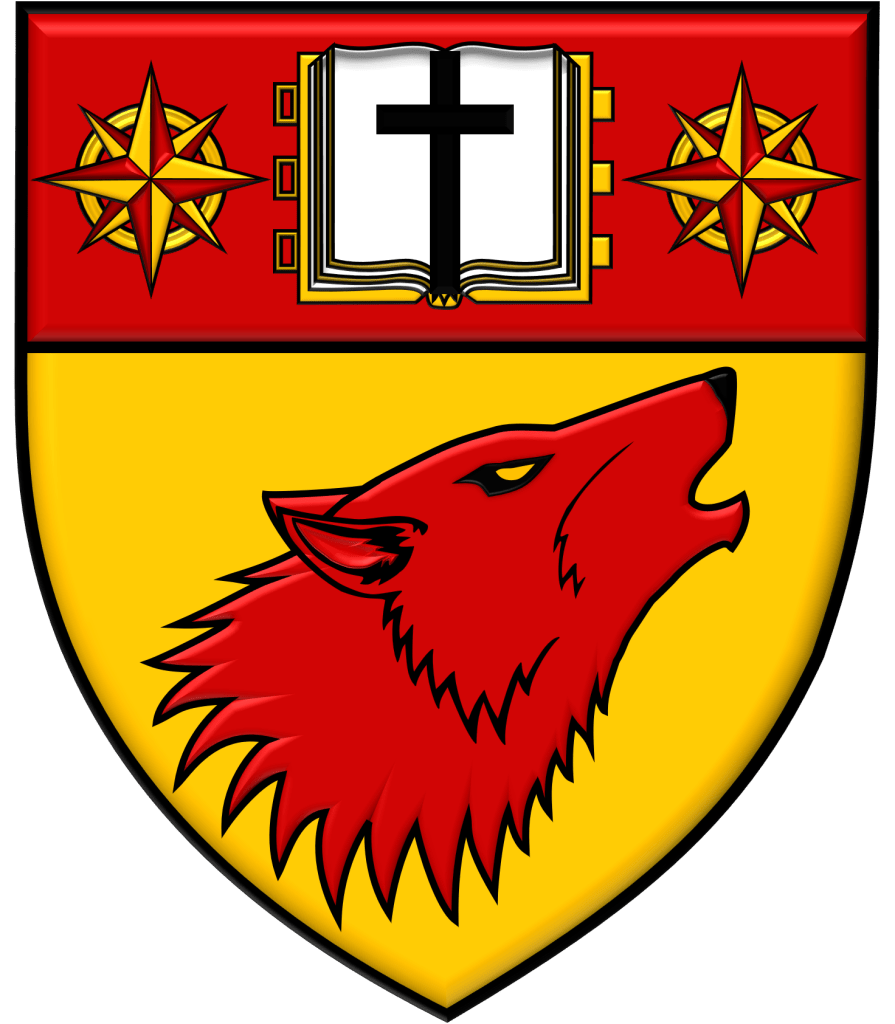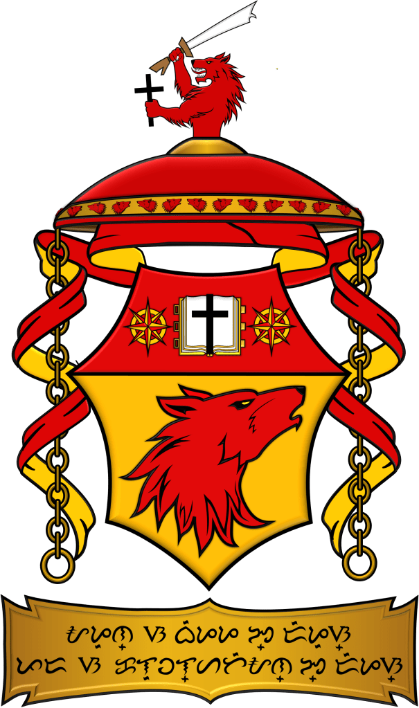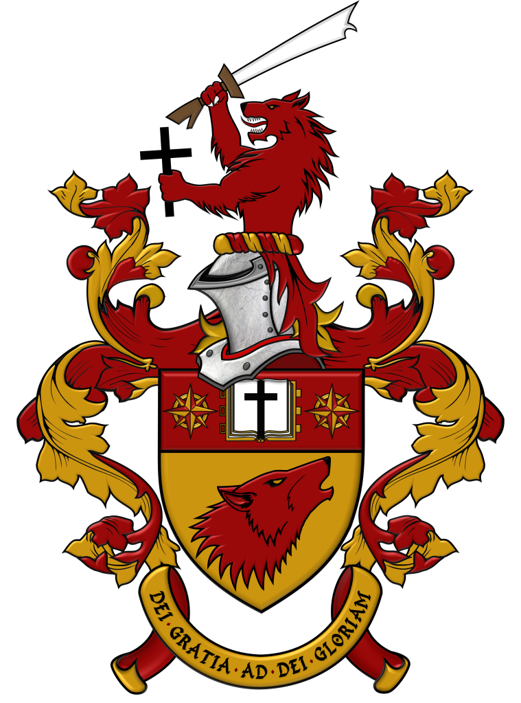 Blazon: Shield: Or, a wolf’s head, erased, ululant and sinister facing Gules, on a chief of the last, between two compass roses Or, upon a book open proper, leathered and garnished Or, a Latin cross Sable. Crest and Mantling: A demi-wolf segreant Gules, grasping dexter a kampilan sword Proper and sinister a latin cross Sable. Motto: Dei Gratia Ad Dei Gloriam (By God’s grace, to God’s glory).