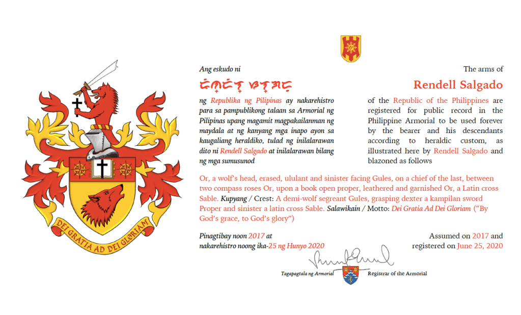 Assumed/granting authority: Assumed, 2017. Registered, Philippine Armorial, June 25, 2020. Registered for copyright, Intellectual Property Office of the Philippines, Reg. No. G-2021-01046, July 28, 2021.