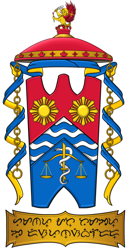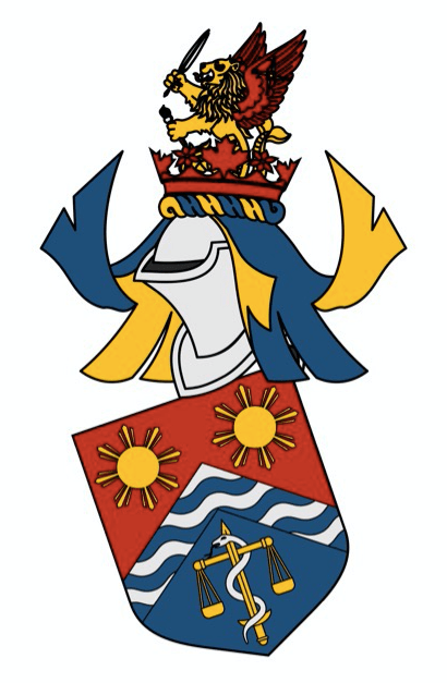 Arms: The colours blue, gold, red and white reflect the national flag of the Philppines, the home of Dr Beswick-Escanlar’s ancestors. The white chevron with blue waves represent a carpenter’s square and unfurled fabrics, recalling his maternal hometown of Taytay, Philippines, a center for woodworks and garments. Over a blue triangle, the waves also allude to seas surrounding a mountain: Mount Napulak, a landmark in Igbaras, Philippines, overlooking Guimbal, Philippines, where he traces his paternal heritage. The two suns are Philippine cultural symbols, and on a red background represent him and his brother, Filipino by heritage and Canadian by birth. The gold sword entwined by a silver serpent stands for Dr Beswick-Escanlar’s career as a military physician. The balance represents his wife, a lawyer.