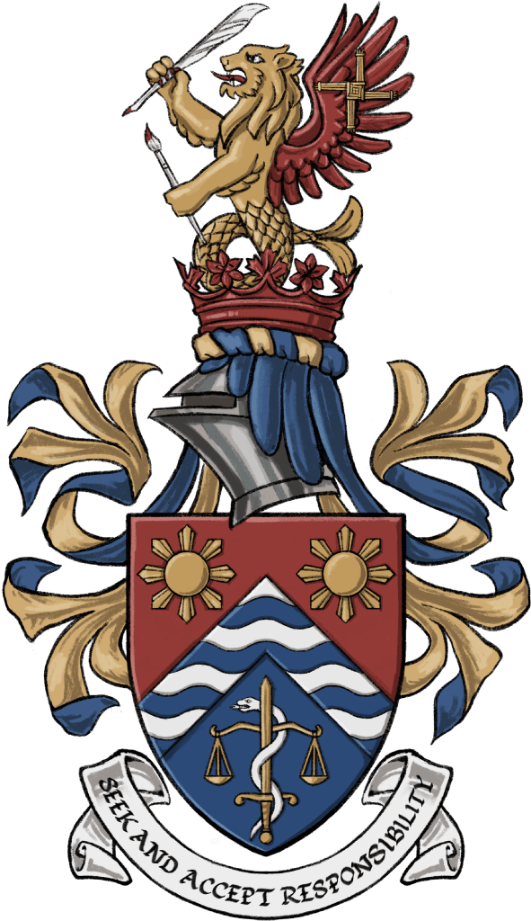 Crest: The sealion is a Philippine cultural symbol and reflects Dr Beswick-Escanlar’s parents; set in a coronet of maple leaves, a symbol of Canada, and prairie lilies, the floral emblem of Saskatchewan, it represents the immigration of his parents. The sealion’s wings allude to the American bald eagle and the heritage of his father-in-law, while the St Brigid cross recalls his mother-in-law’s Irish background and the Beswick-Escanlar’s Catholic faith. The paintbrush honours his father, an artist, and the quill pen his parents-in-law passion for writing.
