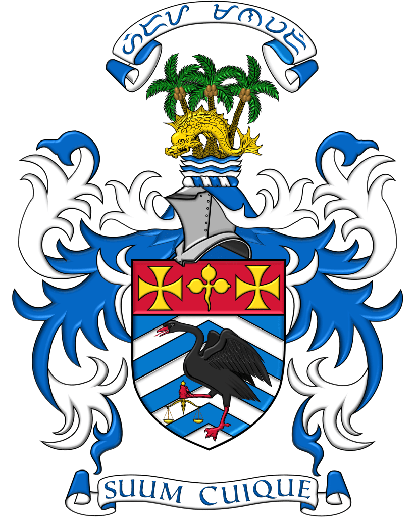 Blazon: Escutcheon: Chevronny of eight Azure and Argent, a swan rousant, wings addorsed and inverted Sable, langued, beaked and membered Gules, holding on the dexter a scales Or, on a chief Gules a trefoil between two crosses pattée Or. Crest: On a wreath of the colors, on water barry wavy Azure and Argent, in front of three coconut palm trees fructed proper, a [heraldic] dolphin naiant Or. Motto: Suum cuique (“To each his own”); Hiraya manawari in Baybayin script (“Reach your dreams”). Badge: On a plate, a swan rousant wings inverted Sable, beaked and membered Gules, gorged with a chain a pendant therefrom a Latin A Or, holding on the dexter foot a scales of the last, all within an annulet Azure fimbriated and inscribed SUUM CUIQUE • HIRAYA MANAWARI (in Baybayin) • in letter Or.