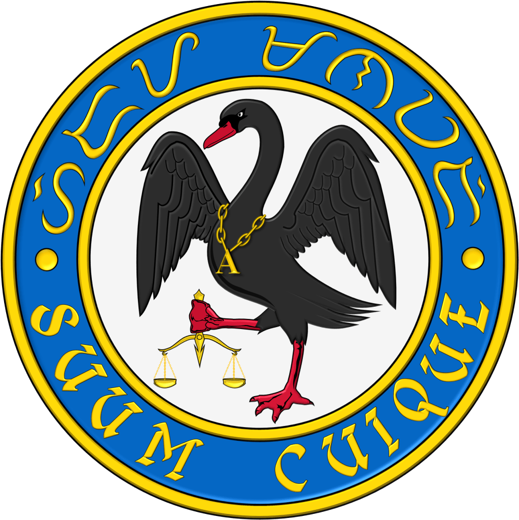 Badge: The symbolism of this emblem is the same as the other elements of the arms except the swan has a chain necklace with a Latin “A” pendant, the initial of the Armiger’s family name.