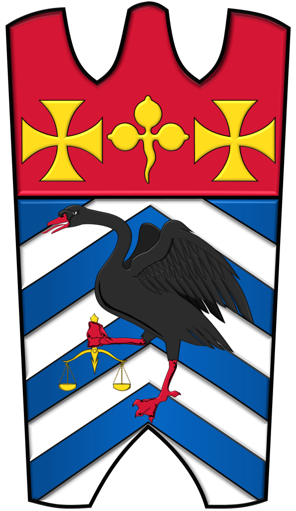 Shield: The variation and the colors of the field are a reference to the armiger’s education (blue and white are his school’s colors). The armiger chose the swan as the main charge as it traditionally symbolizes grace and beauty as well as everlasting love and loyalty as swans are known to be monogamous creatures. Moreover, the black color of the swan symbolizes the armiger’s passion for discovery and his belief that anything is possible which is in reference to the fact that black swans were believed to be non-existent until they were discovered. The balance scales held by the swan symbolizes justice but is also an allusion to the armiger’s astrological sign, Libra. The trefoil in the chief represents the armiger’s immediate family as he is an only child and the crosses symbolize his Christian faith and heritage. The color of the chief symbolizes blood ties and intimacy.