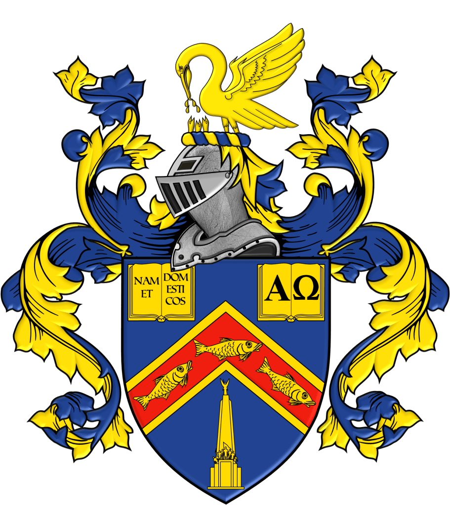 Blazon: Azure, on a chevron Gules fimbriated Or three fishes, between in chief two open books inscribed Sable to dexter “Nam et Domesticos”, to sinister an Alpha and Omega, and in base the Monument of Gat Andres Bonifacio, all Or.