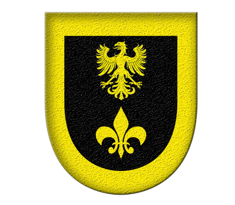 Blazon: Shield: Sable, in chief an eagle displayed, in base a fleur-de-lis, all within a bordure Or.