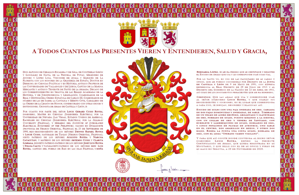 Assumed/granting authority: Assumed, August 2020. Registered, Cronista de Armas de Castilla y León, No. 69/2020, November 20, 2020. Registered, Philippine Armorial, January 29, 2021.