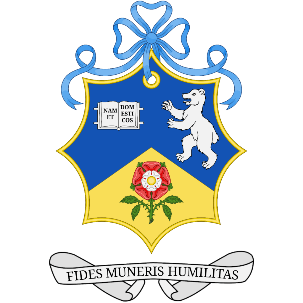 Blazon: Shield: Per chevron Azure and Or, in chief dexter an open book inscribed with the words “Nam et Domesticos”, in chief sinister a bear rampant, all Argent, in base a rose proper.