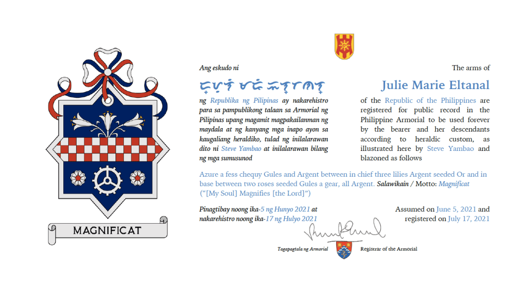 Assumed/granting authority: Assumed, June 5, 2021. Registered, Philippine Armorial, July 17, 2021.