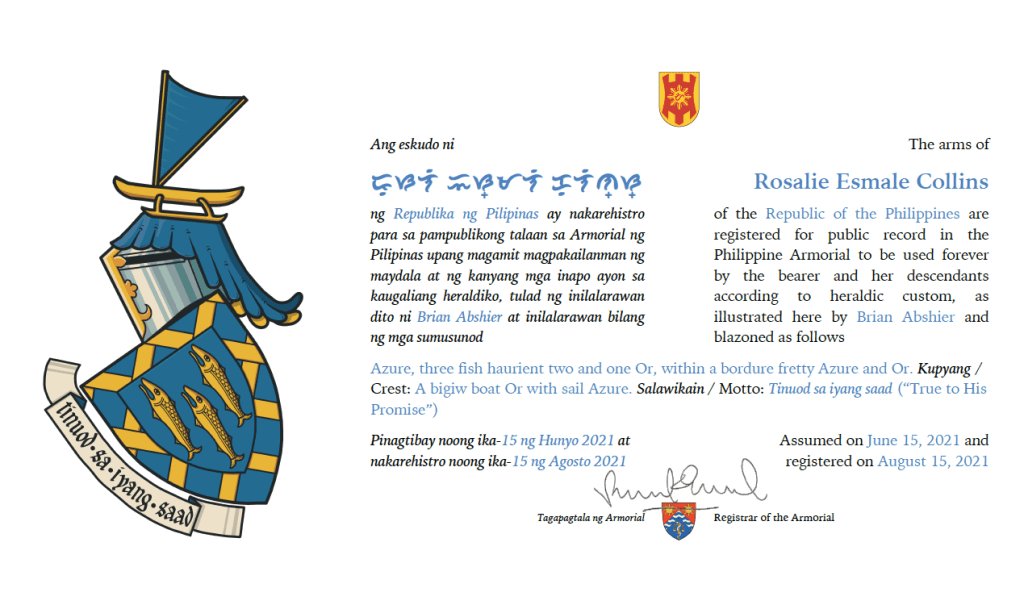 Assumed/granting authority: Assumed, June 15, 2021. Registered, Philippine Armorial, August 15, 2021.
