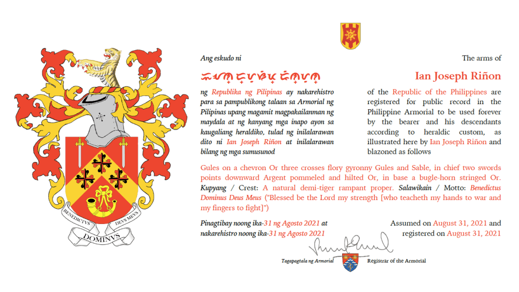 Assumed/granting authority: Assumed, August 31, 2021. Registered, Philippine Armorial, August 31, 2021.