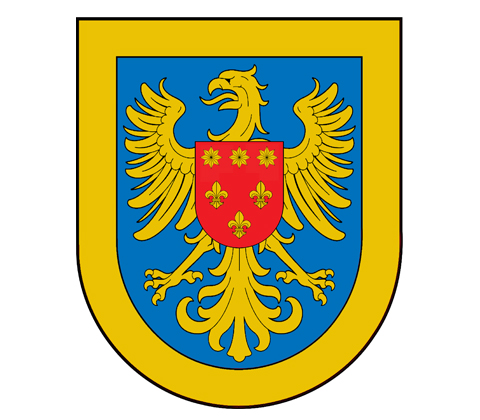 Blazon: Shield: Azure an eagle displayed Or charged on the breast with an escutcheon Gules thereon three fleurs de lis two and one below three mullets in chief all Or, all within a bordure Or.
