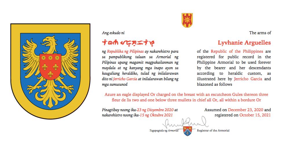 Assumed/granting authority: Assumed, December 23, 2020. Registered, Philippine Armorial, October 15, 2021.