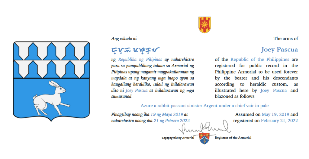 Assumed/granting authority: Assumed, May 19, 2019. Registered, Philippine Armorial, February 21, 2022.