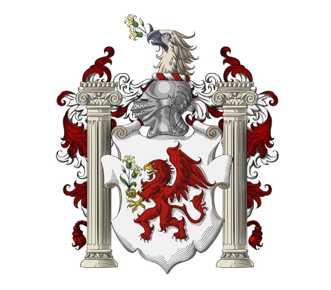 Blazon: Shield: Argent a gryphon segreant Gules beaked and armed Or clutching a branch of white lilies slipped and leaved proper.