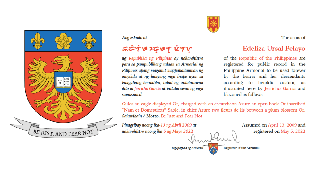 Assumed/granting authority: Assumed, April 13, 2009. Motto assumed, 2013. Registered, Philippine Armorial, May 5, 2022.