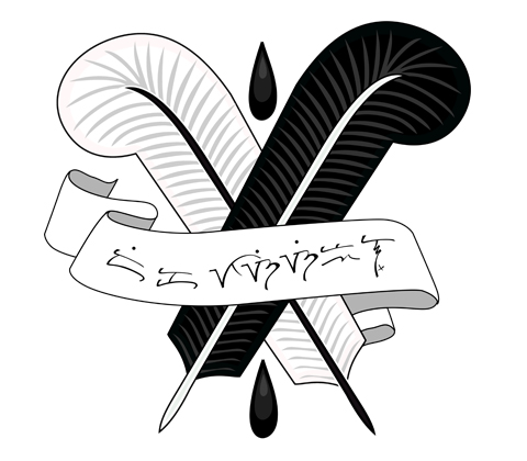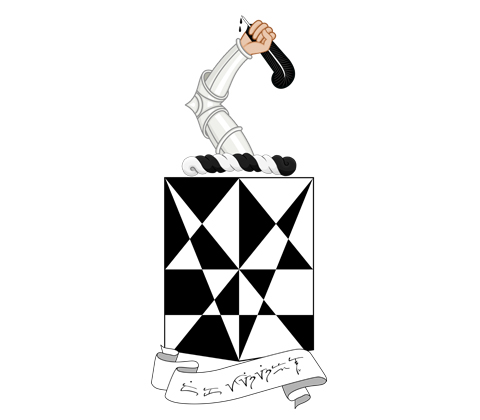 Badge: A quill Argent tipped Sable and a quill Sable tipped Argent in saltire, in chief and base each a goutte de poix, overall a scroll inscribed “‘Di ka pasisiil” written in Philippine abugida Baybayin.