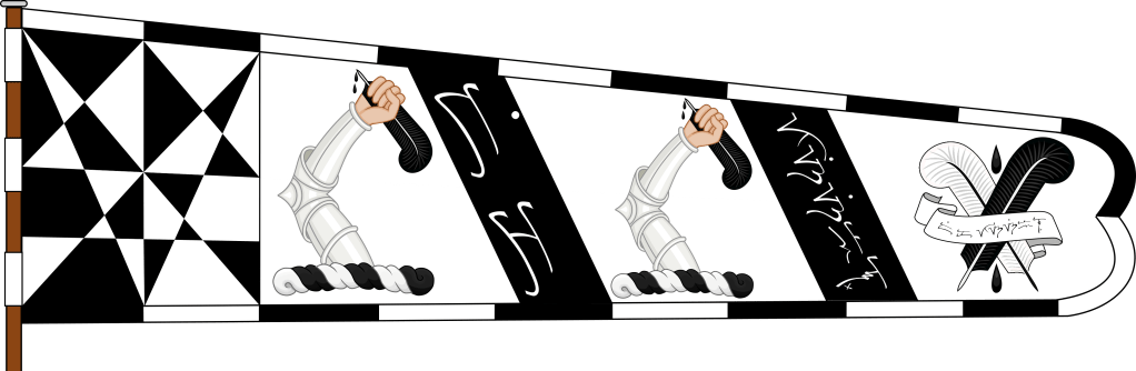 In the crest, the quill and the gouttes of ink symbolizes the Armiger’s love for creative writing, as a visual representation of the writer’s motto, “Keep bleeding [ink to write]”.