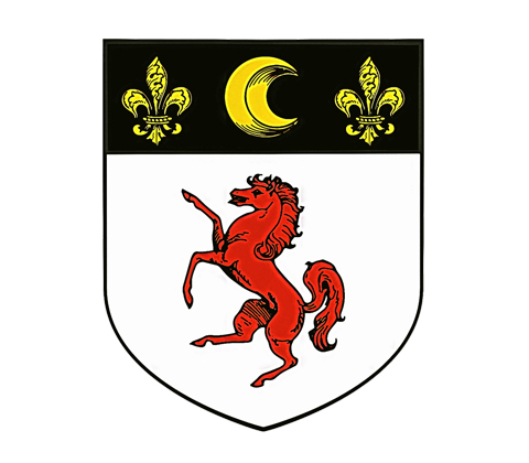 Shield: Argent a horse forcené Gules, on a chief Sable a decrescent between two fleurs de lis, all Or