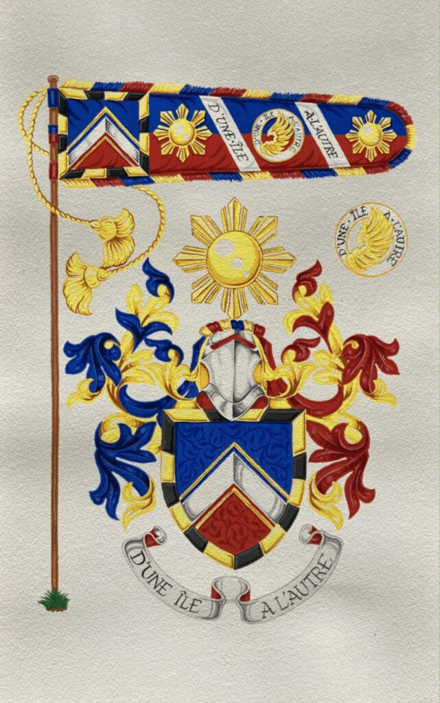 The field of azure and gules is taken from the national colors of the Philippines and the United Kingdom, and represent dual blood and dual identity – equally British and Filipino. The colors also represent the blue of academic study and the red of passion and honor.