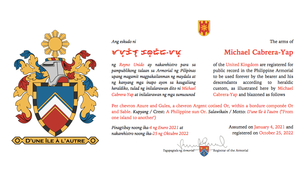 Assumed/granting authority: Assumed, January 4, 2021. Registered, Philippine Armorial, October 25, 2022.