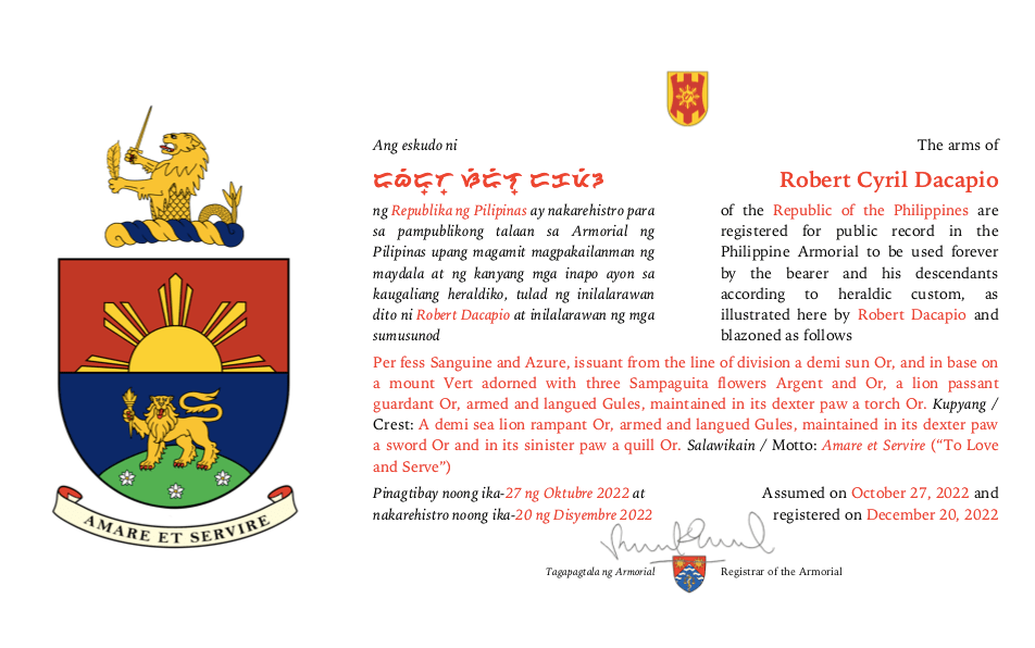 Assumed/granting authority: Assumed, October 27, 2022. Registered, Philippine Armorial, December 20, 2022.