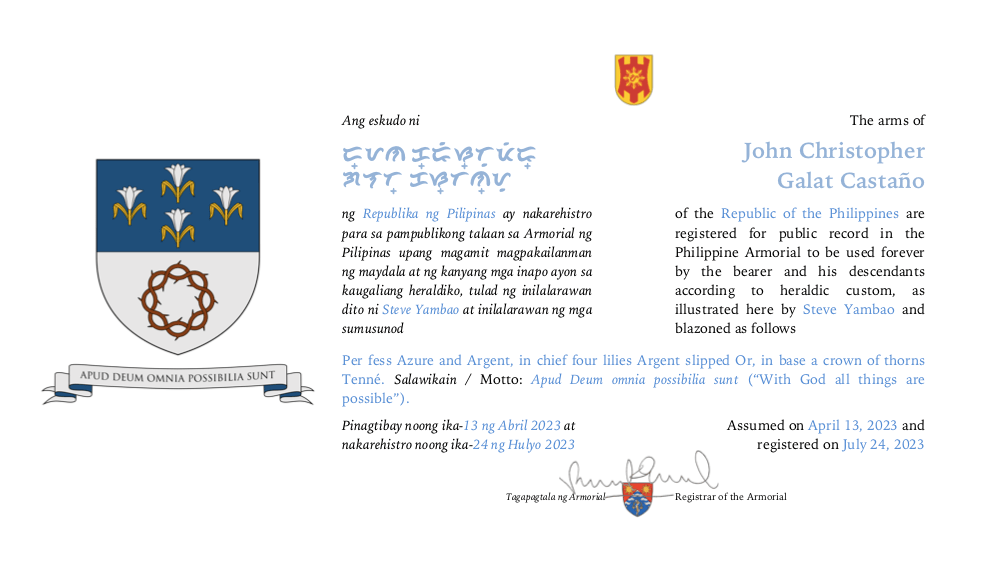Assumed/granting authority: Assumed, April 13, 2023. Registered, Philippine Armorial, July 24, 2023.