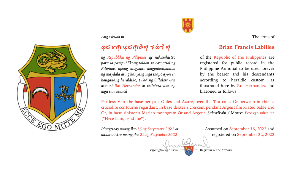 Assumed/granting authority: Assumed, September 16, 2022. Registered, Philippine Armorial, September 25, 2022.
