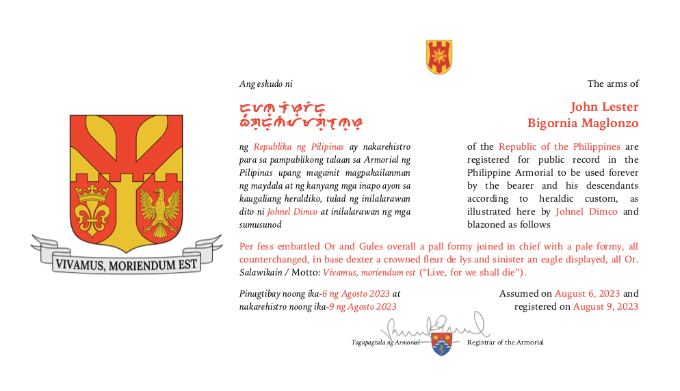 Assumed/granting authority: Assumed, August 6, 2023. Registered, Philippine Armorial, August 9, 2023.