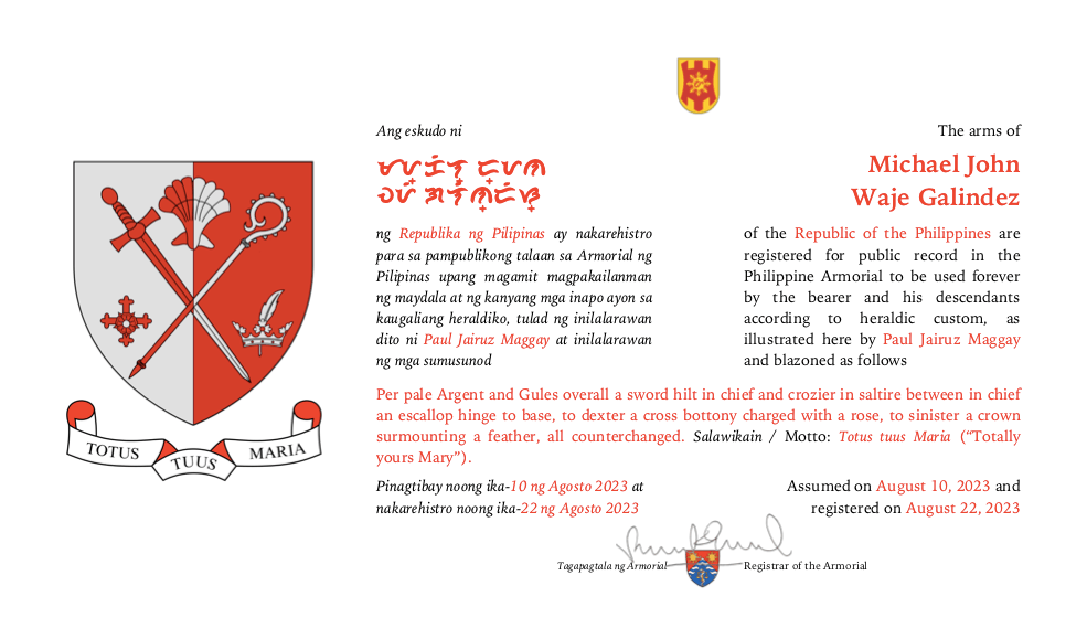 Assumed/granting authority: Assumed, August 10, 2023. Registered, Philippine Armorial, August 22, 2023.