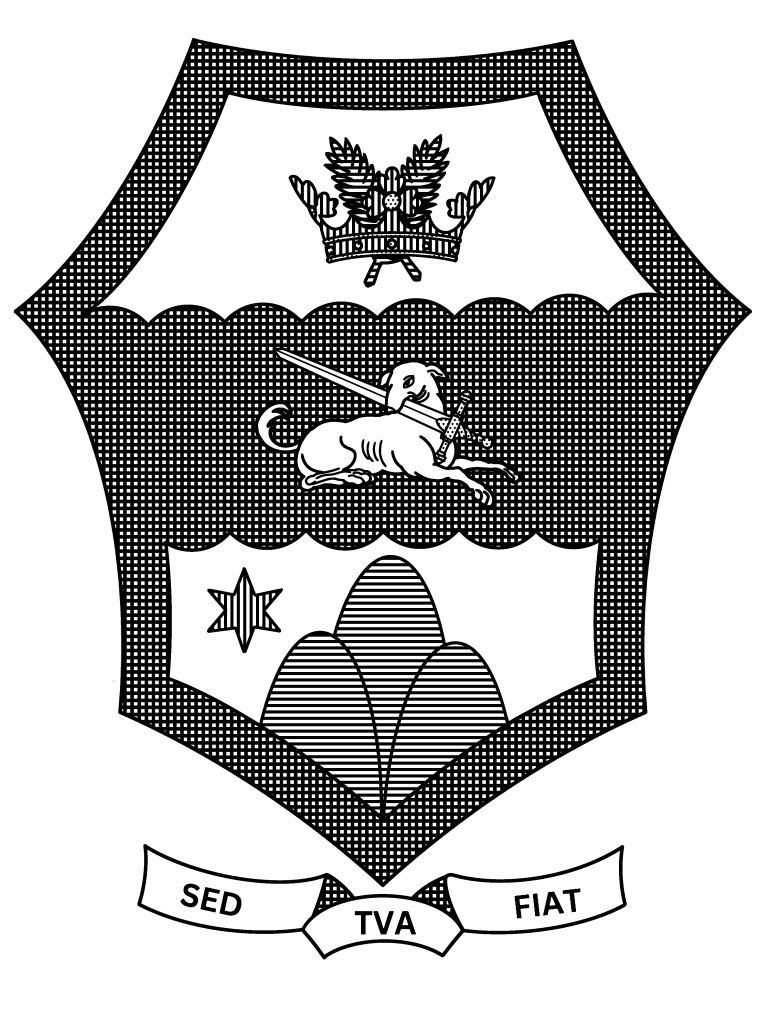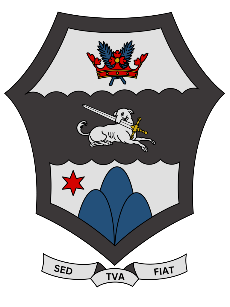 Blazon: Shield: Argent on a fess invected Sable, between in chief two palm fronds in saltire Azure surmounted by a coronet Gules, in base a trimount Azure and at dexter base a star of six points Gules, a dog contourné couchant regardant Argent holding in its mouth a sword Argent hilted Or, all within a bordure Sable.