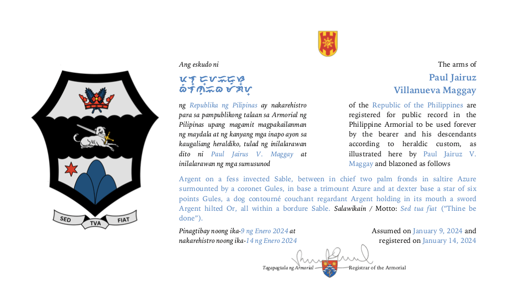 Assumed/granting authority: Assumed, January 9, 2024. Registered, Philippine Armorial, January 14, 2024.