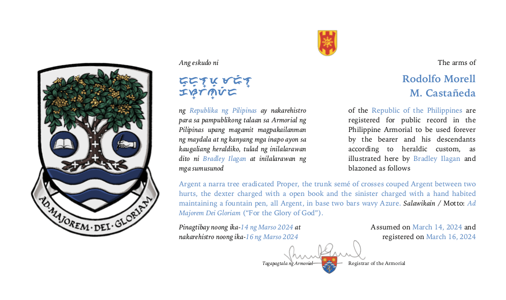 Assumed/granting authority: Assumed, March 14, 2024. Registered, Philippine Armorial, March 16, 2024.