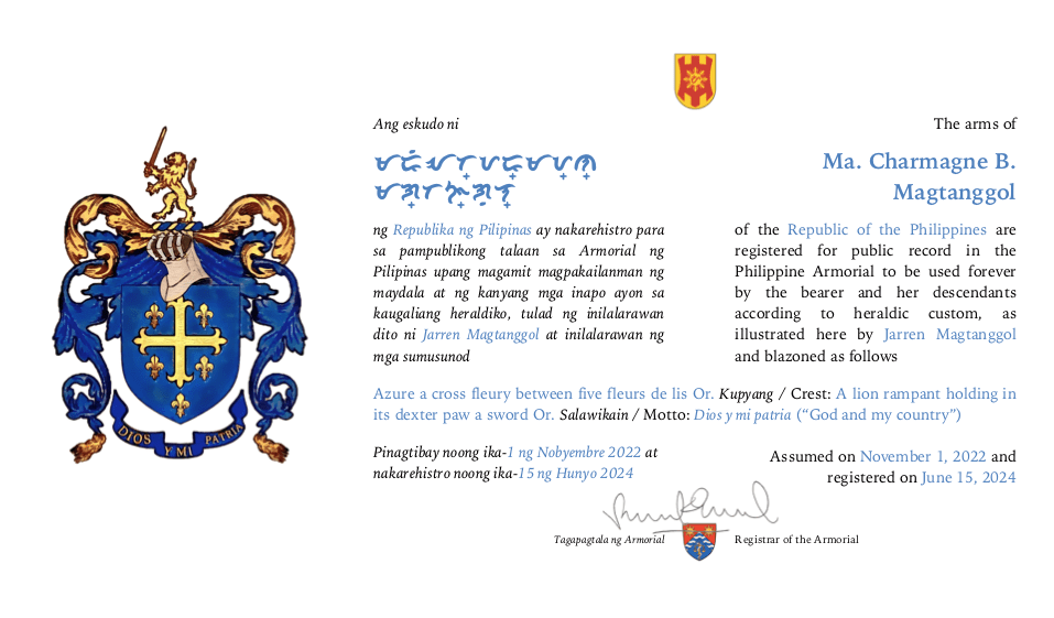 Assumed/granting authority: Assumed, November 1, 2022. Registered, Philippine Armorial, June 15, 2024.