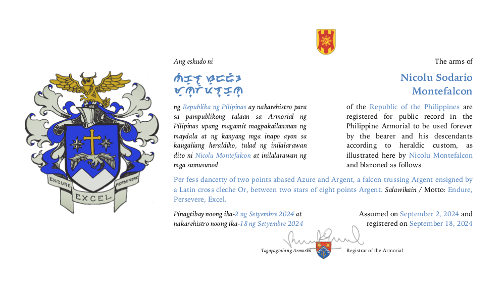 Blazon: Shield: Per fess dancetty of two points abased Azure and Argent, a falcon trussing Argent ensigned by a Latin cross cleche Or, between two stars of eight points Argent.