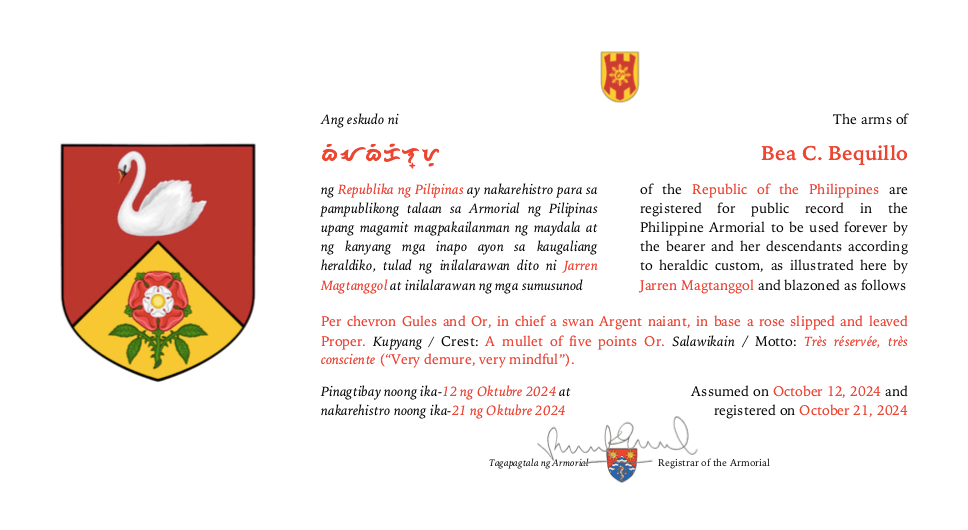 Assumed/granting authority: Assumed, October 12, 2024. Registered, Philippine Armorial, 21 October, 2024.