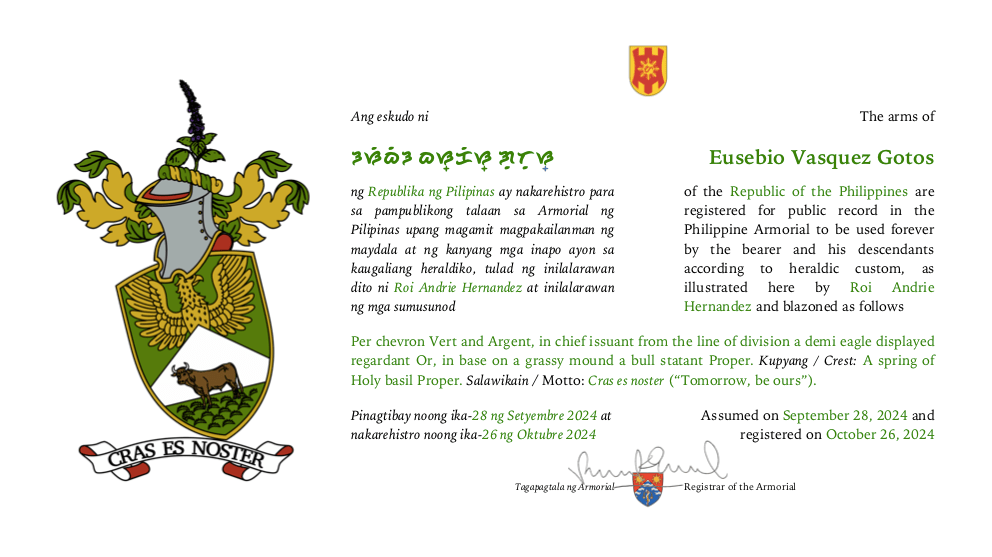 Assumed/granting authority: Attributed posthumously to the Armiger by the Armiger’s grandson, Jade Michael Gotos Paez, September 28, 2024. Registered, Philippine Armorial, October 26, 2024.