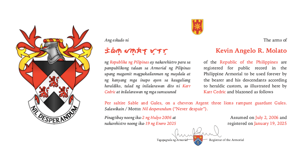 Assumed/granting authority: Assumed, July 2, 2006. Registered, Philippine Armorial, January 19, 2025.