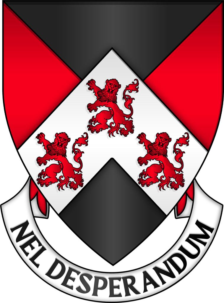 Blazon: Shield: Per saltire Sable and Gules, on a chevron Argent three lions rampant guardant Gules.