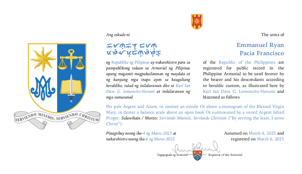 Assumed/granting authority: Assumed, March 4, 2025. Registered, Philippine Armorial, March 6, 2025.