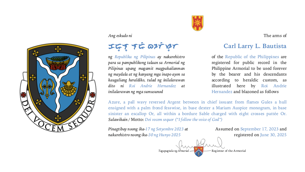 Assumed/granting authority: Assumed, September 17, 2023. Registered, Philippine Armorial, June 30, 2025.