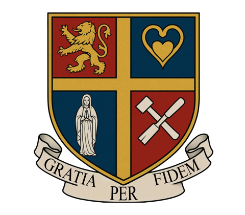 Blazon: Shield: Quarterly Gules and Argent, 1st a lion rampant, 2nd a heart voided surmounted in base by a heart Or, 3rd an image of the Virgin Mary in prayer affronté, 4th a hammer and chisel in saltire Argent, overall a cross Or.