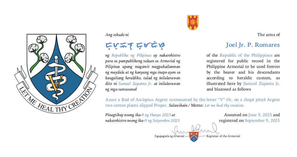 Assumed/granting authority: Assumed, June 9, 2025. Registered, Philippine Armorial, September 9, 2025.