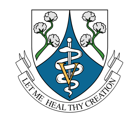 Blazon: Shield: Azure a Rod of Asclepius Argent surmounted by the letter “V” Or, on a chapé ployé Argent two cotton plants slipped Proper.
