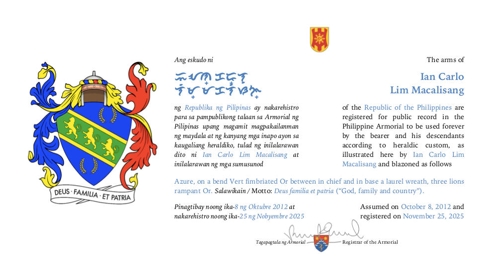 Assumed/granting authority: Assumed, October 8, 2012. Registered, Chinese Armorial, October 8, 2012; Philippine Armorial, November 25, 2025.
