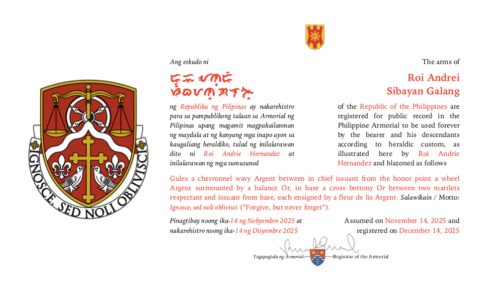 Assumed/granting authority: Assumed, November 14, 2025. Registered, Philippine Armorial, December 14, 2025.