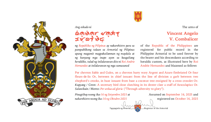 Assumed/granting authority: Assumed, September 16, 2025. Registered, Philippine Armorial, October 16, 2025.