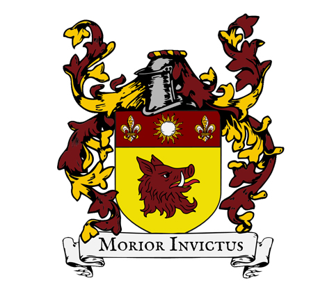 Blazon: Shield: Or a boar’s head erased and facing sinister Gules, on a chief Gules a sun in splendor between two fleurs de lis Or.