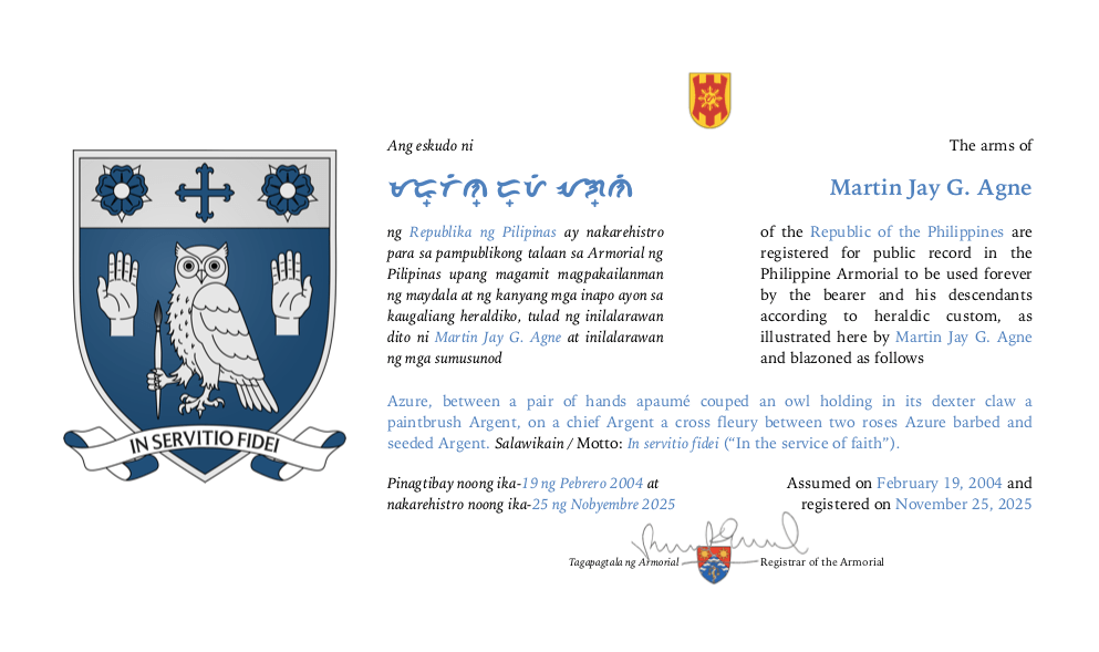 Assumed/granting authority: Assumed, February 19, 2004. Registered, Philippine Armorial, November 25, 2025.