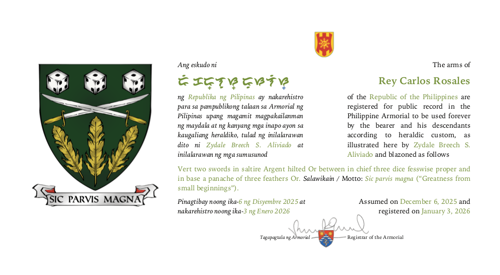 Assumed/granting authority: Assumed, December 6, 2025. Registered, Philippine Armorial, January 3, 2026.