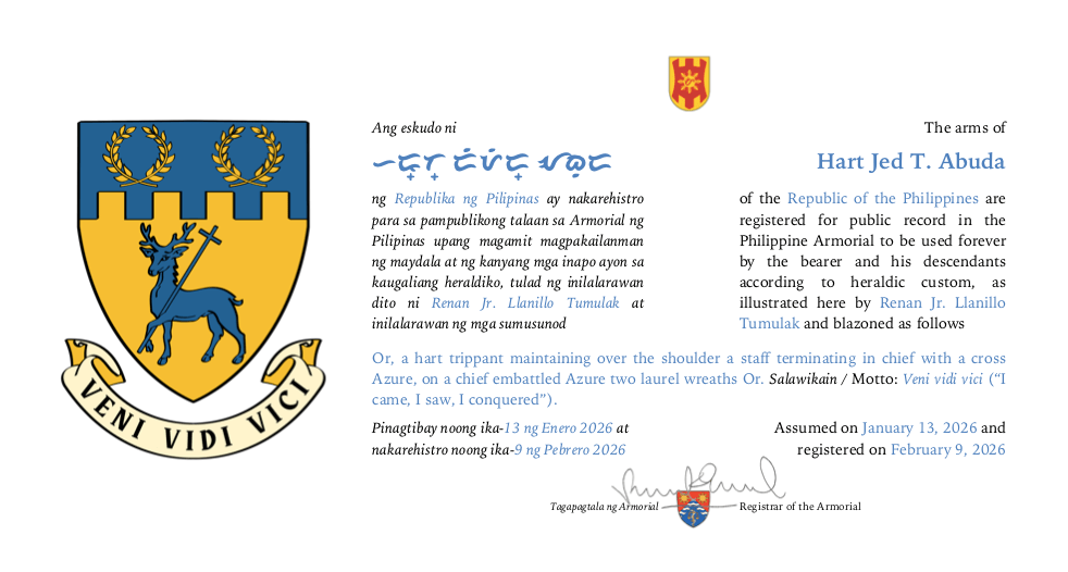 Assumed/granting authority: Assumed, January 13, 2026. Registered, Philippine Armorial, February 9, 2026.
